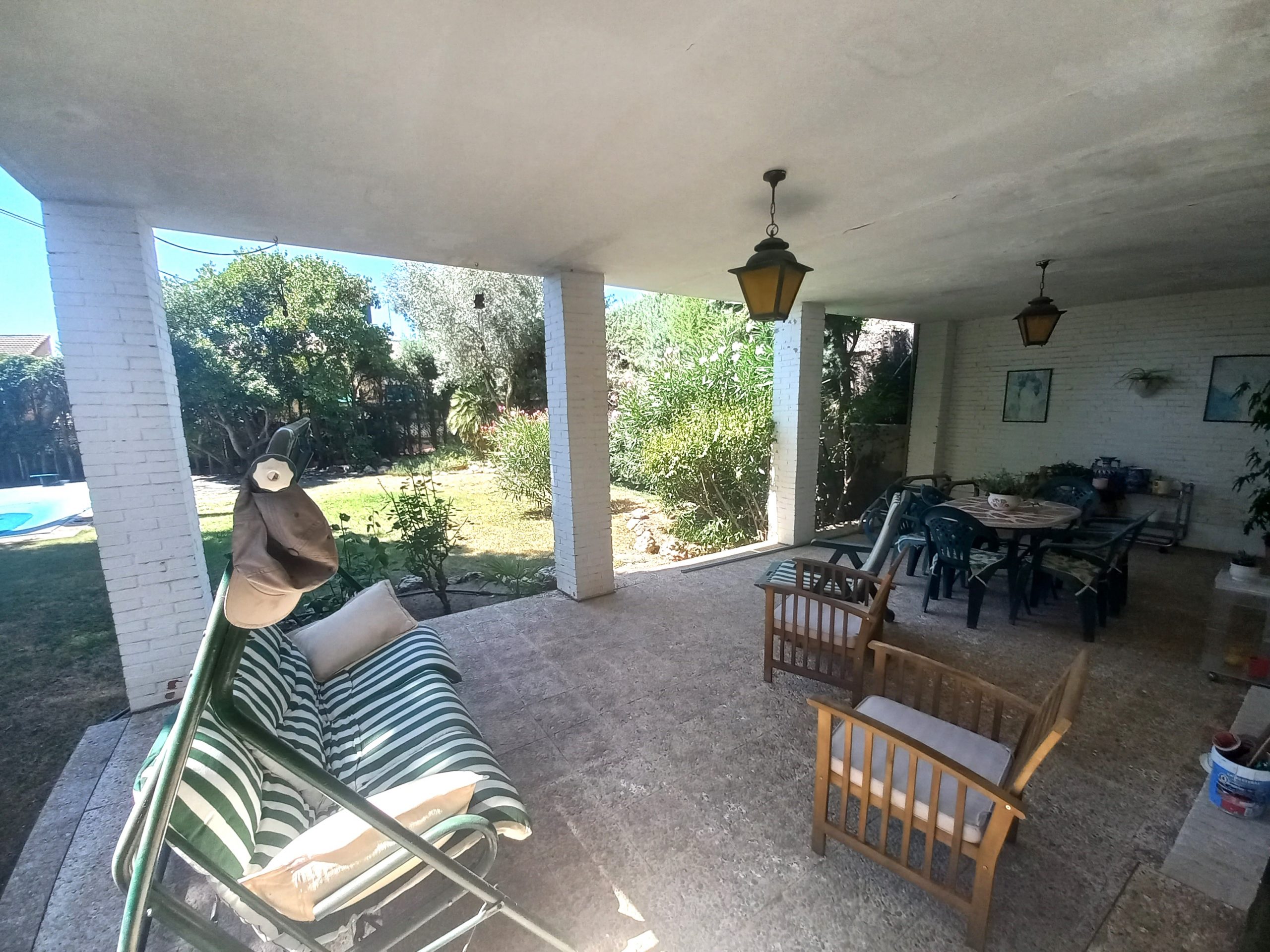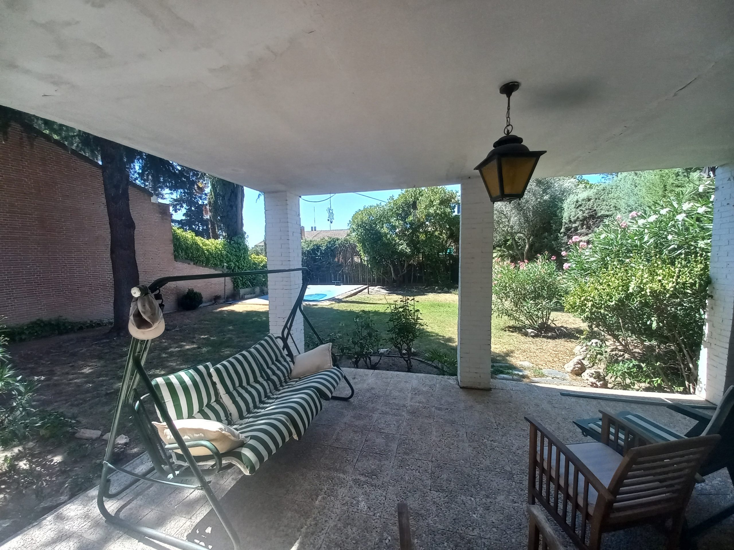 - SalĂłn-comedor amplio con salida directa al jardĂn, que cuenta con un gran porche y piscina privada