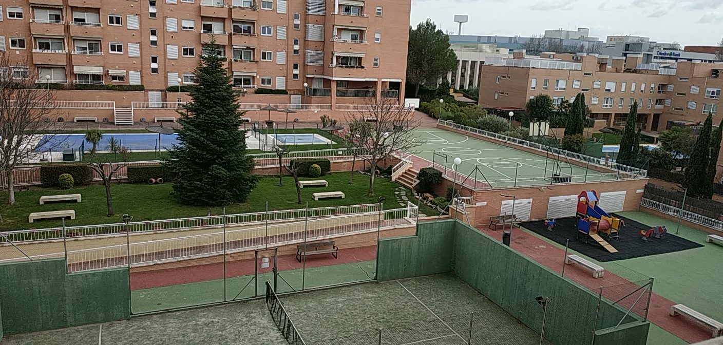 La urbanización privada ofrece zonas comunes como área infantil, dos piscinas (niños y adultos), pista de pádel, gimnasio, sauna, servicio de portería y amplias zonas verdes.